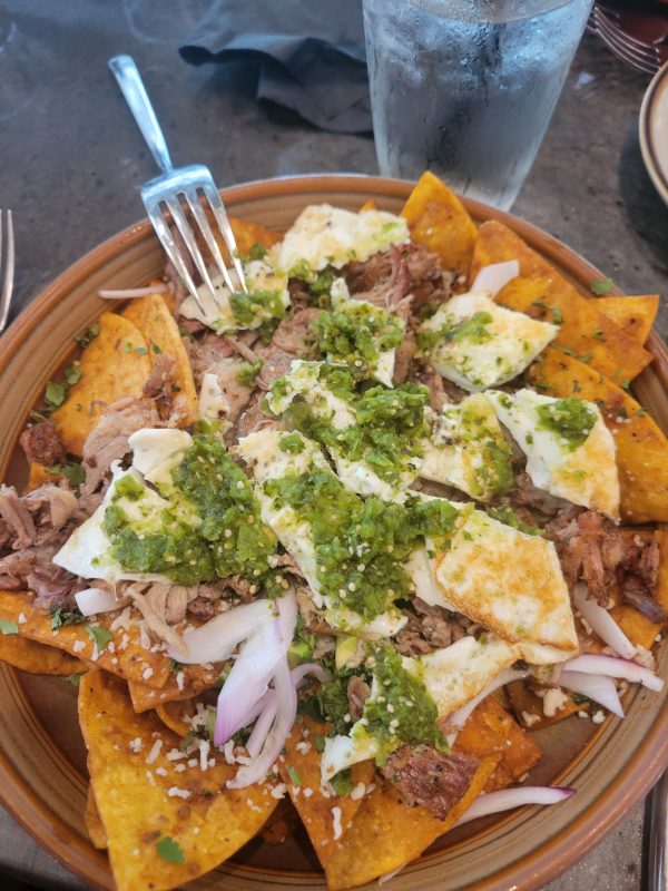 I got chilaquiles topped with carnitas and a fried egg for ($14) and my husband ordered a Seafood Saltado (Shrimp, scallops, avocado, peppers on top of white rice) ($22).