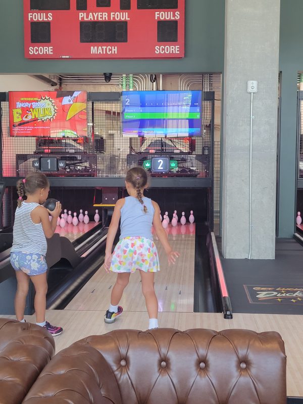 It’s time for dinner. We walked to Ducky’s, one of Fort Wayne’s newest family-friendly restaurants, and it didn’t disappoint. The atmosphere is great for kids. We were able to have them eat their food in less than 20 minutes because they wanted to go bowling in their mini lanes (right across from our table).
