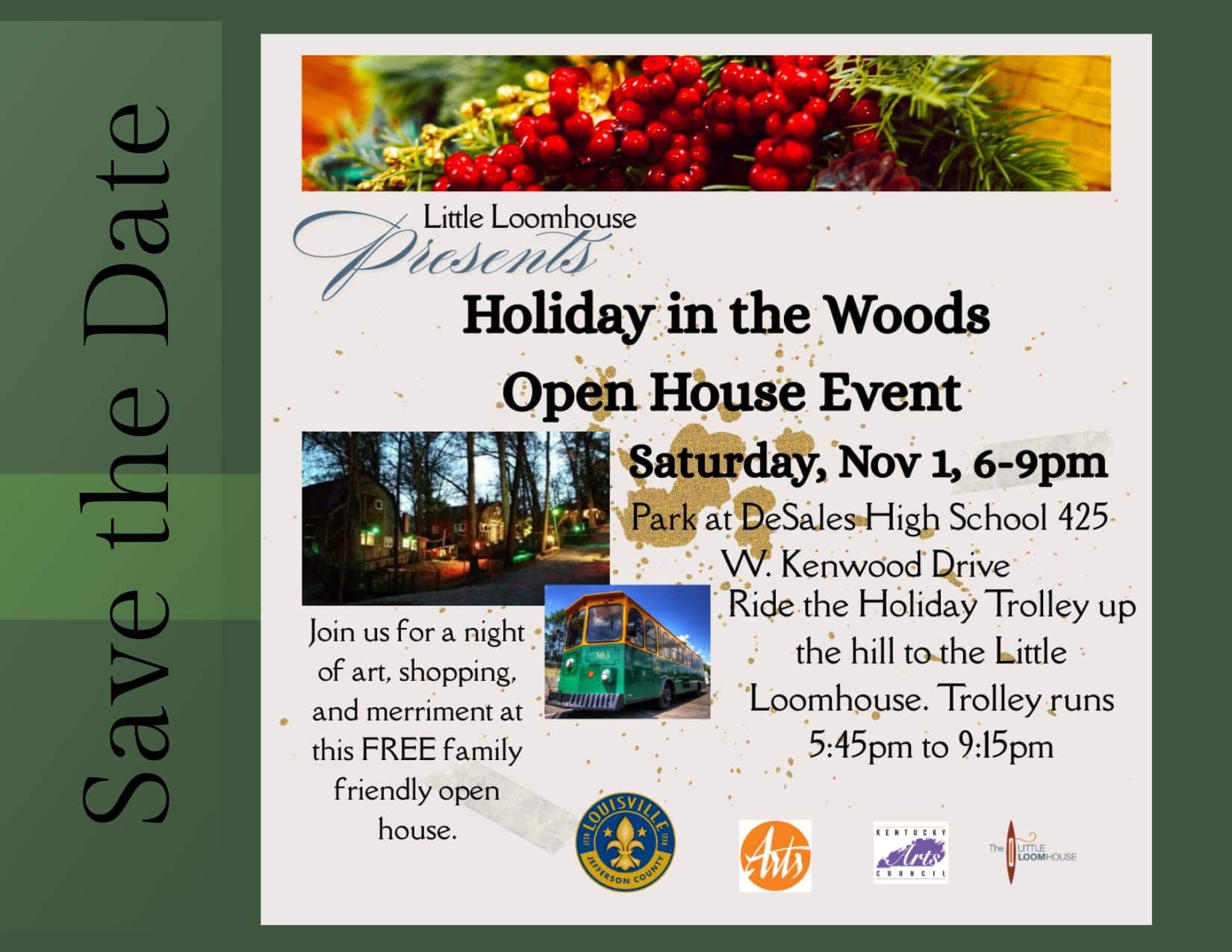 Holiday in the Woods – November 1, Join The Little Loomhouse for an evening of art, shopping, and merriment at their Open House Event from 6pm – 9pm. Parking for the Little Loomhouse Holiday in the Woods will be at DeSales High School, 425 W. Kenwood Drive with a shuttle up Kenwood Hill.