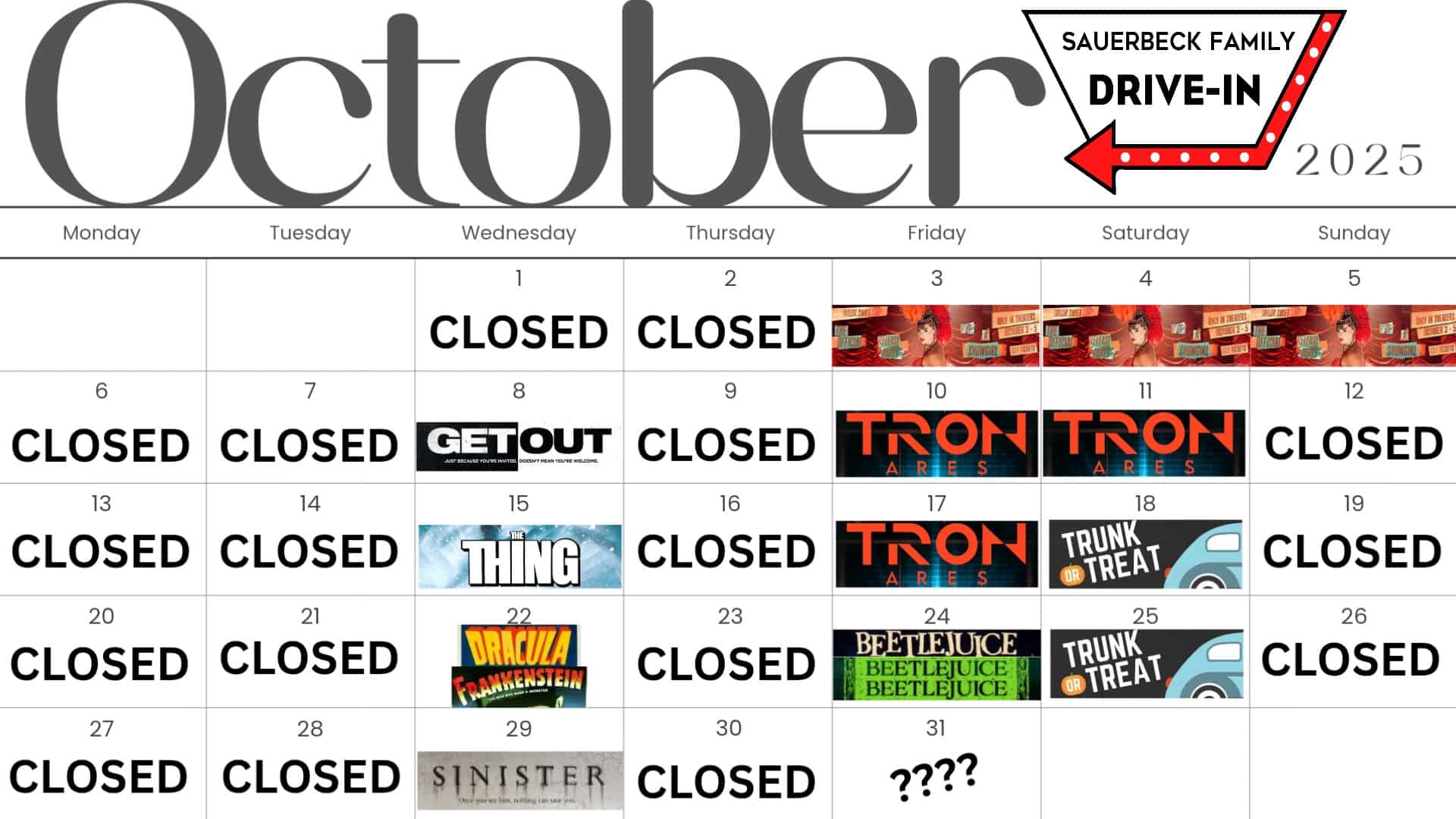Watch some great Horror Movies at the Drive-In each Wednesday in October! This week Sauerbeck Drive-In will feature The Thing with gates opening at 7pm and the show starting at 7:45pm.