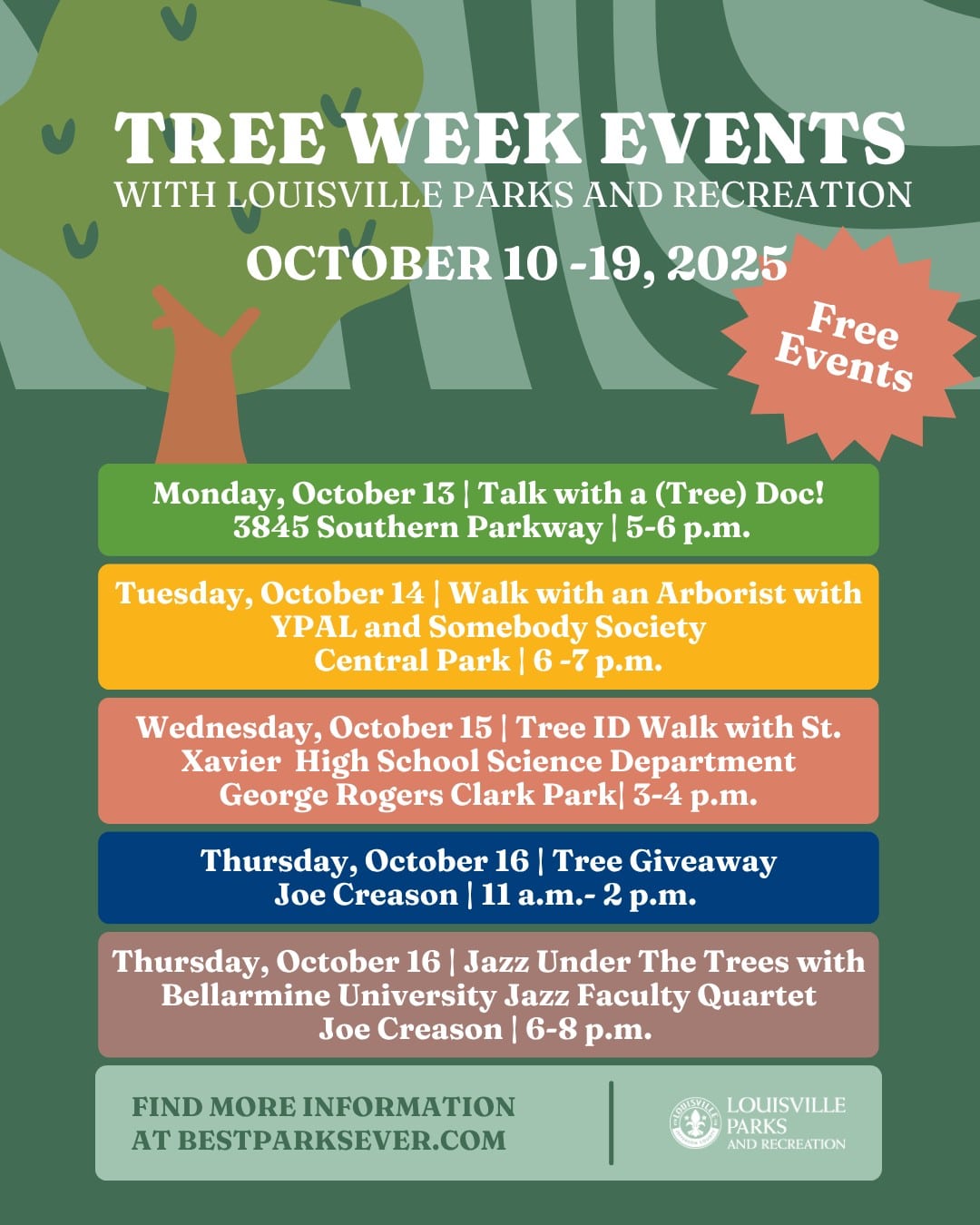 Louisville Parks and Recreation is thrilled to announce their lineup for TreesLouisville‘s Tree Week! Join them for five tree-filled activities throughout the week, including a tree giveaway and Jazz Under the Trees. They can’t wait to see you there!