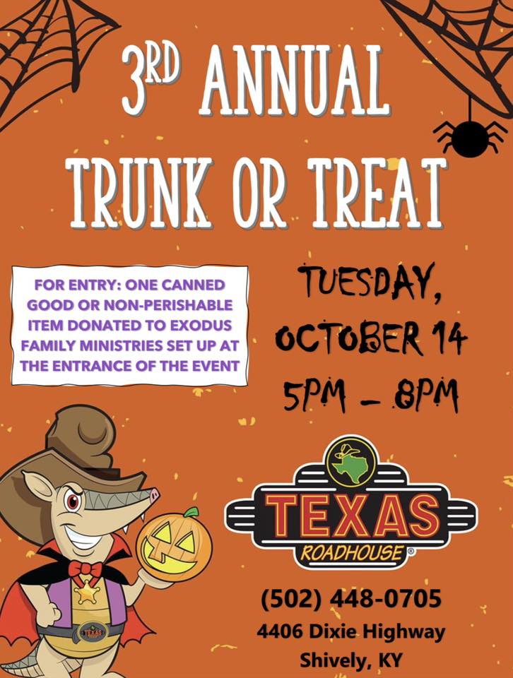 Join Texas Roadhouse Shively for their spooktacular Trunk or Treat Event on Tuesday, October 14 from 5pm – 8pm! Come dressed in your favorite costume and enjoy the night with us for some festive fun!