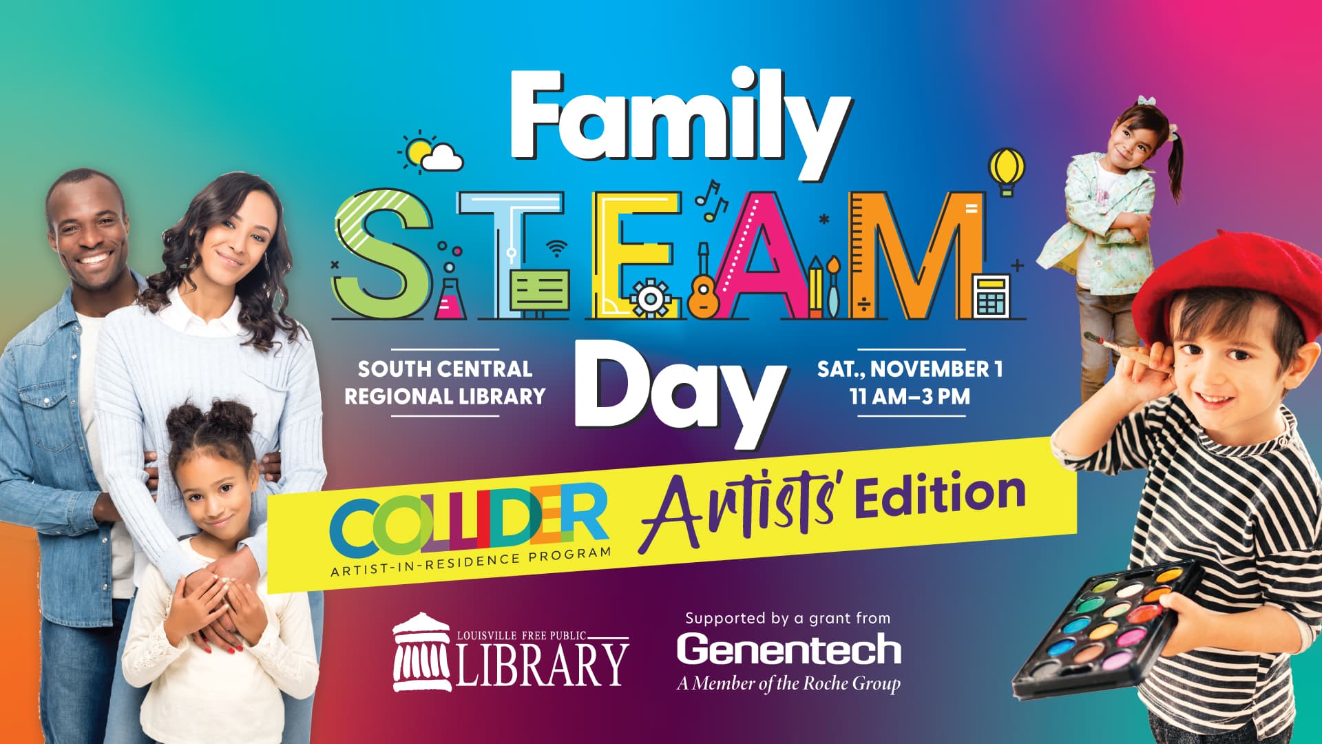 Join the South Central Regional Library for a fun-filled day of art and science featuring multi-media art, animation, drawing, storytelling, fiber arts, print making, balloons, and more at STEAM Day! 11am-3pm